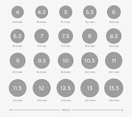 Our ring sizes are all in US sizes. You may refer to the image below, purchase our ring sizer kit or use a piece of string to go around the finger you intend to wear it on and choose the corresponding size.